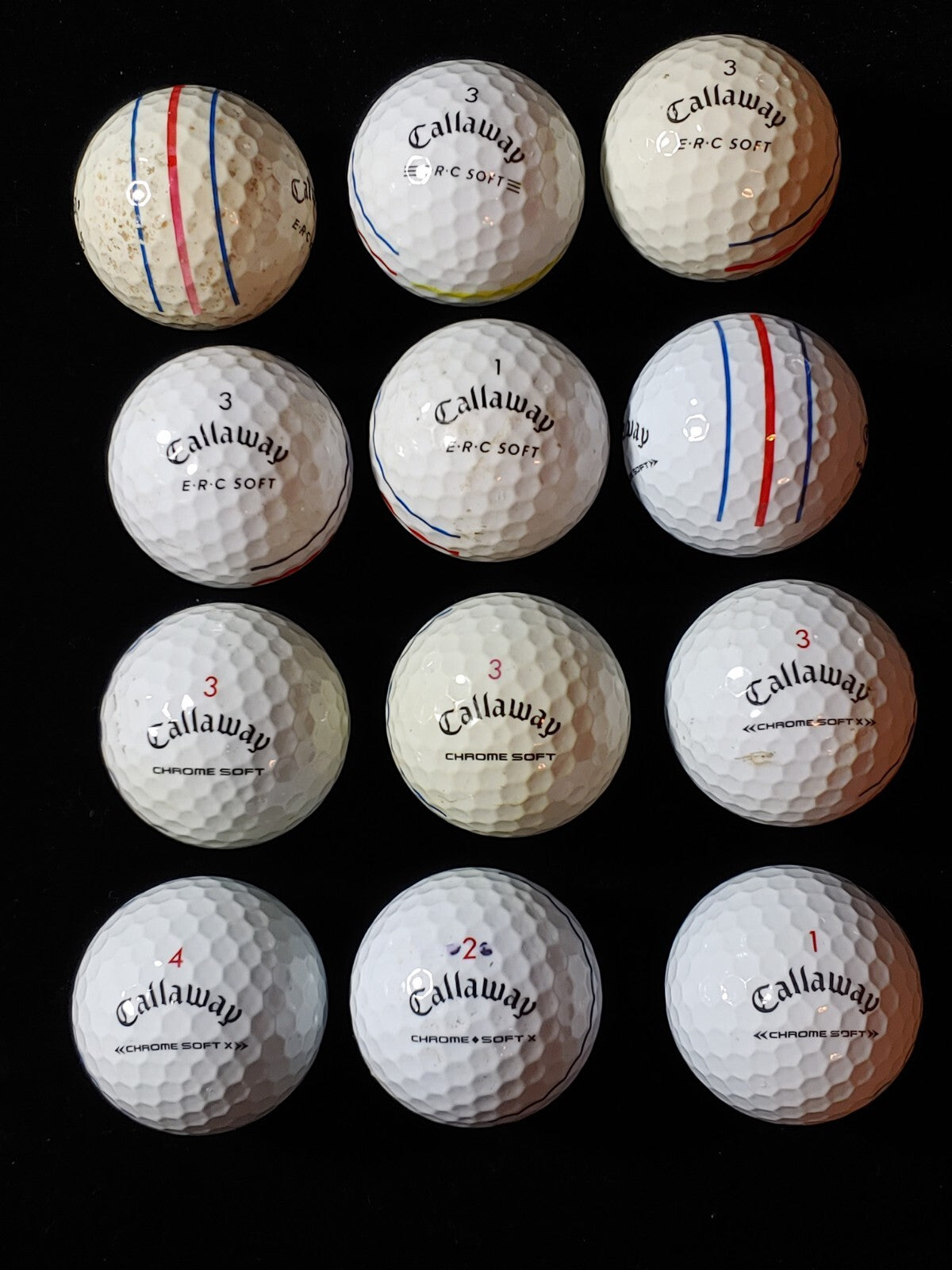 12 CALLAWAY ERC-CHROME SOFT GOLF BALLS GOOD CONDITION SOME STAINS/ MARKS NO CUTS! VERY PLAYABLE ALL HAVE THE 3 ALIGNMENT LINES